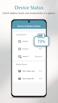 Quickly check shade information on the device status summary page for the battery levels and connectivity of all devices in all rooms. Prompt users to take necessary actions if any device with low battery or disconnected.